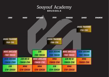 Jiu-Jitsu Brésilien : Discipline axée sur le combat au sol, mettant l’accent sur les contrôles, les renversements et les soumissions (clé de bras, étranglements, etc.). Le but est de dominer l’adversaire en utilisant la technique plutôt que la force.